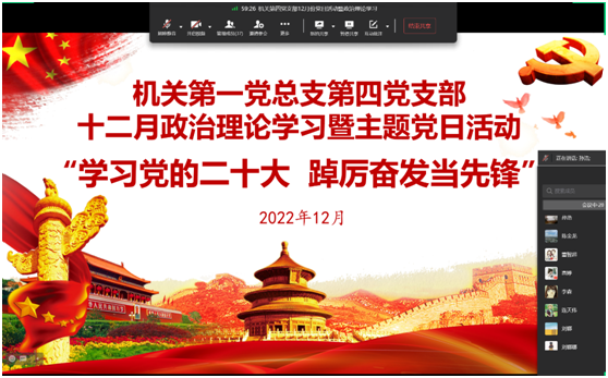 2022年12月28日,机关第四党支部通过企业微信的形式组织开展12月份主题党日暨政治理论学习活动,全体党员、积极分子共计27人参加会议,支部书记孙浩主持会议。